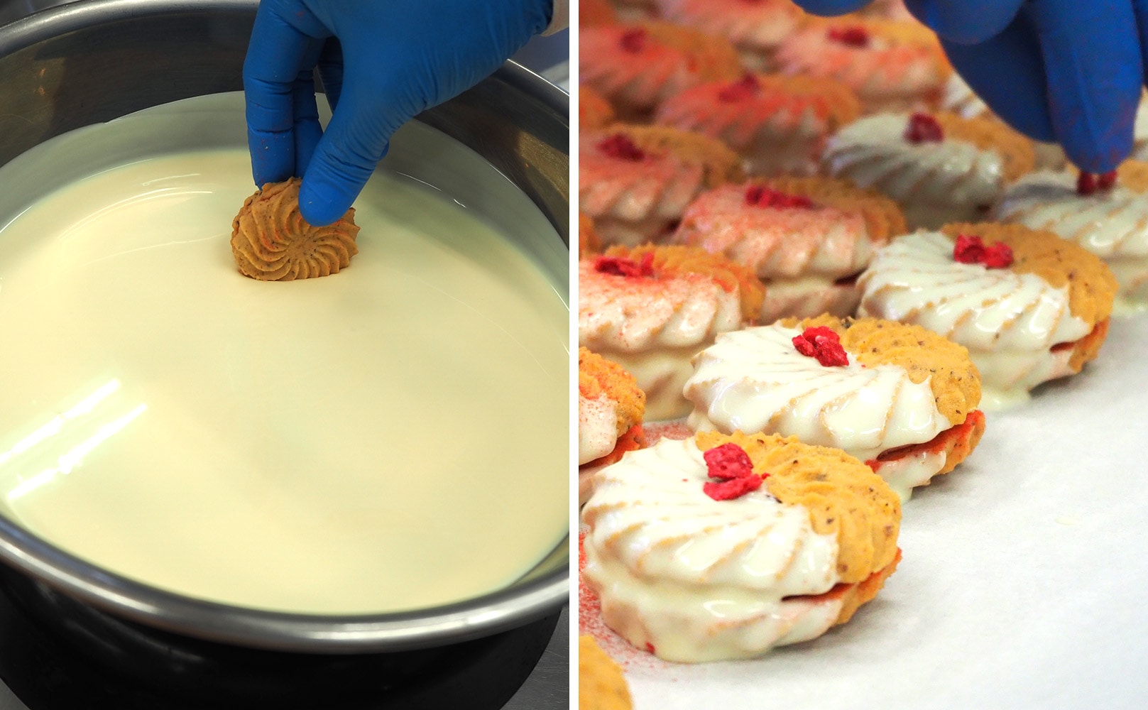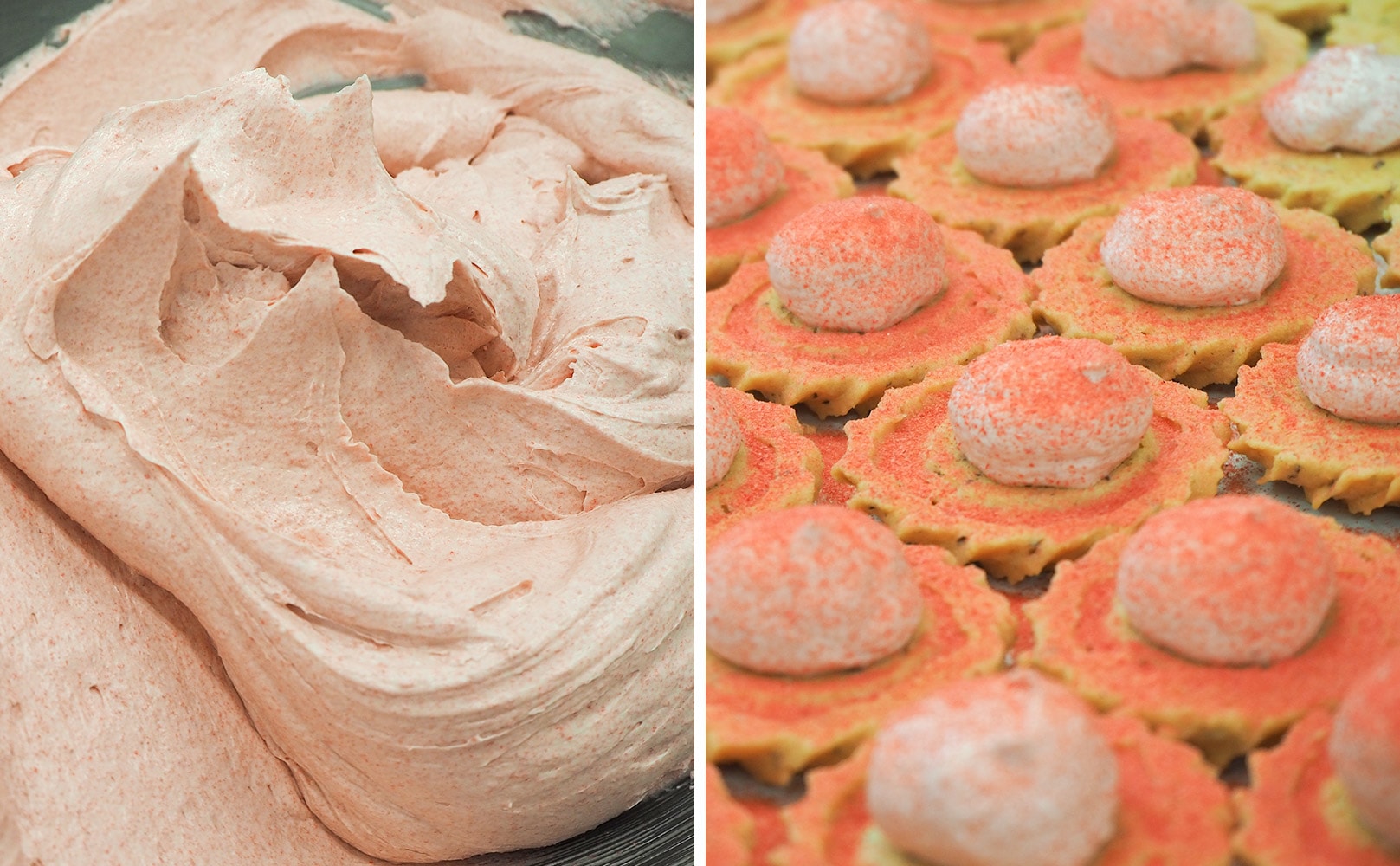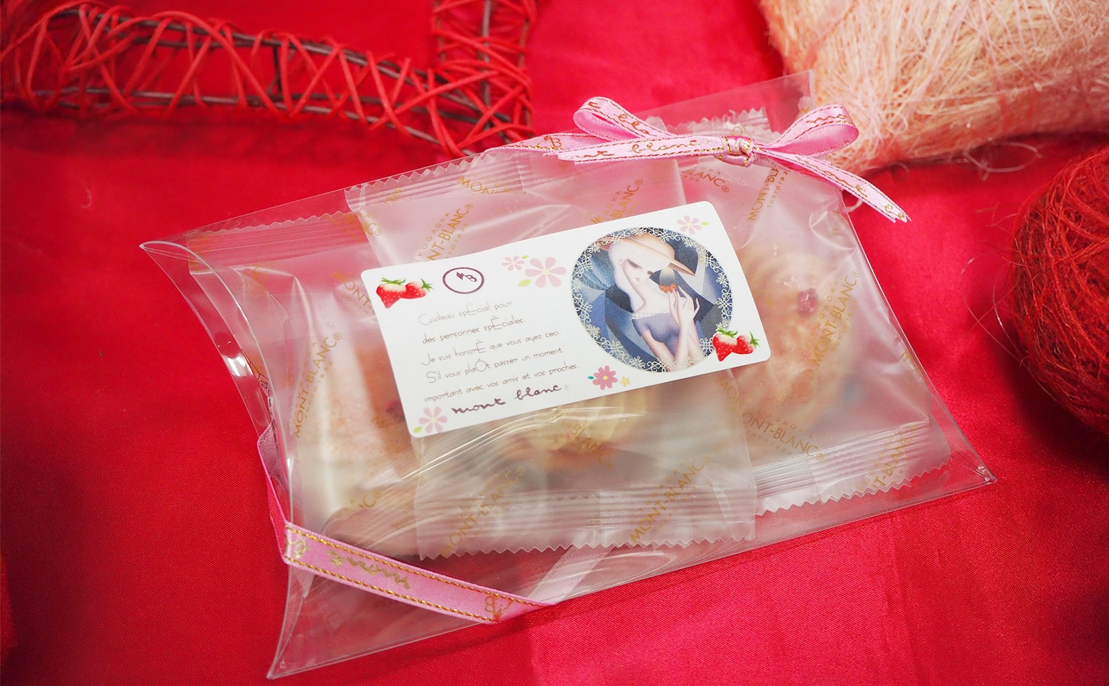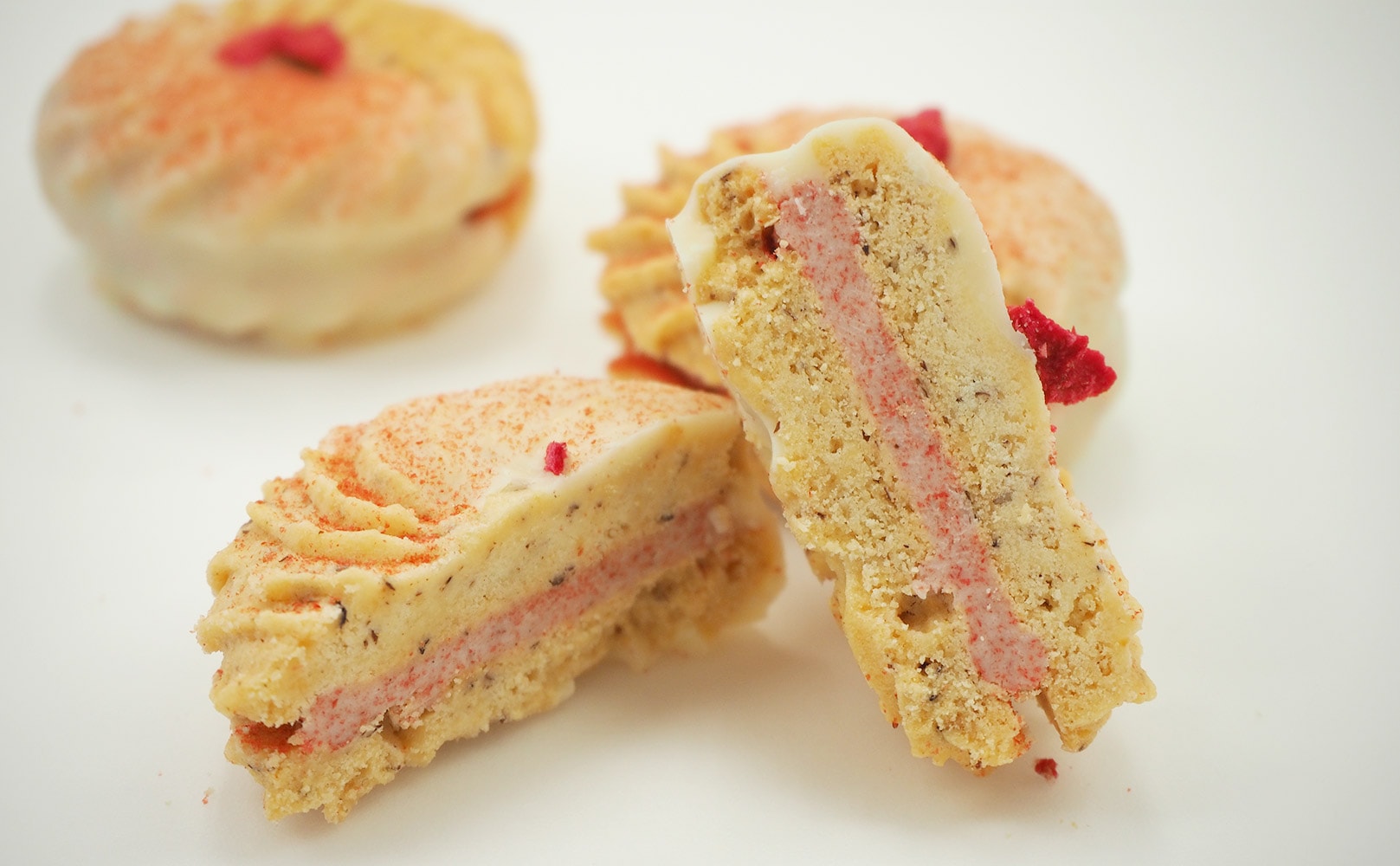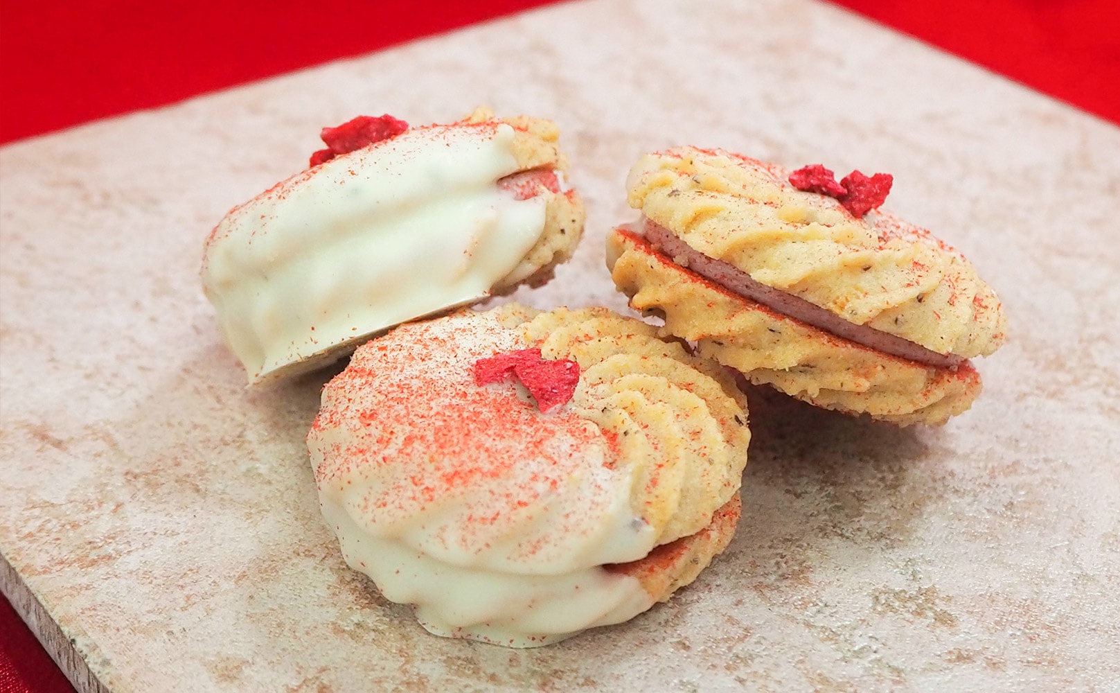 香り豊かで程よい酸味のストロベリーパウダーたっぷりの口どけ滑らかな苺クリームをサンド。苺クリームの上からさらにストロベリーパウダーをかけ、袋から取り出した瞬間、お口に入れた瞬間苺を感じ味わえる一工夫。