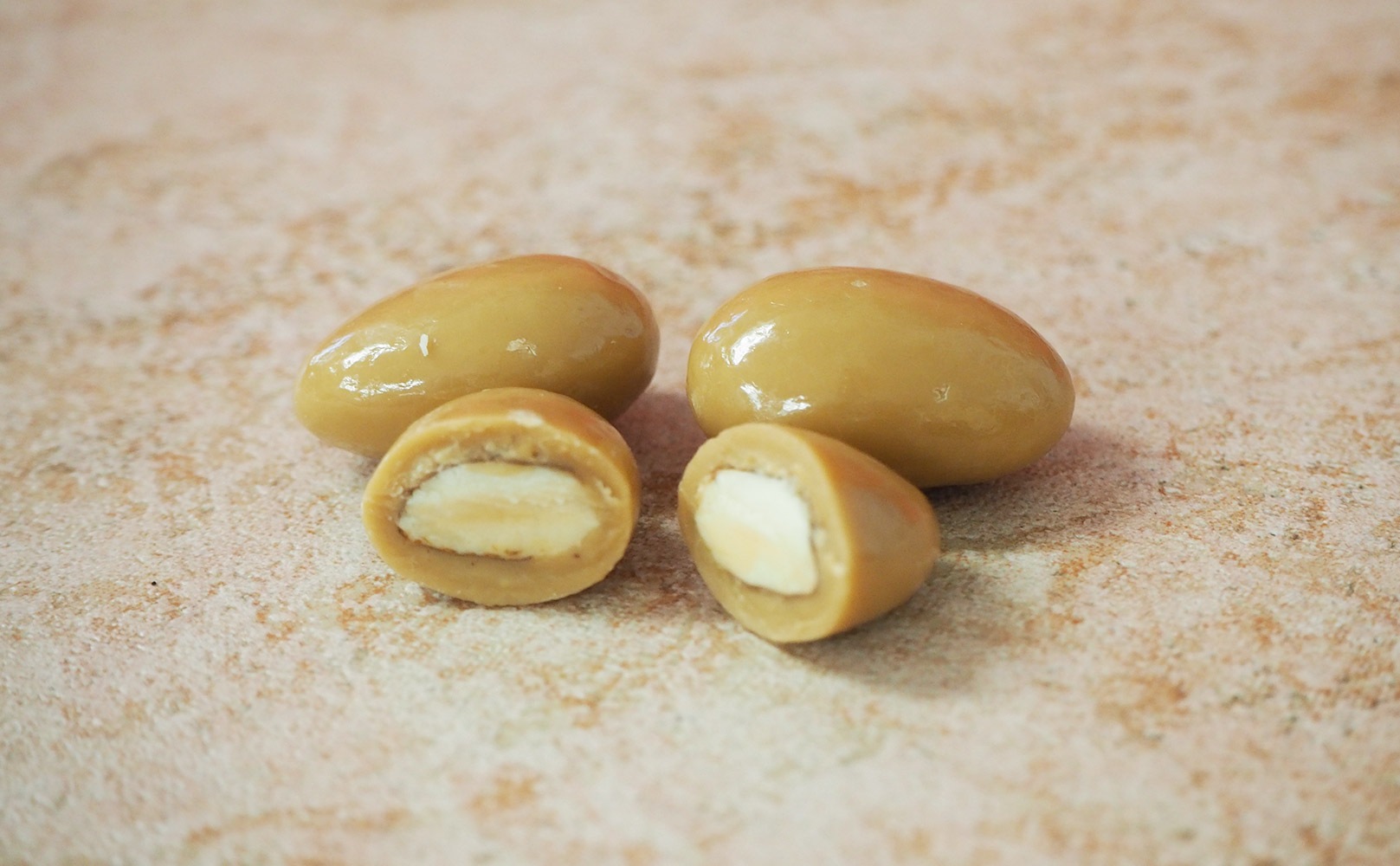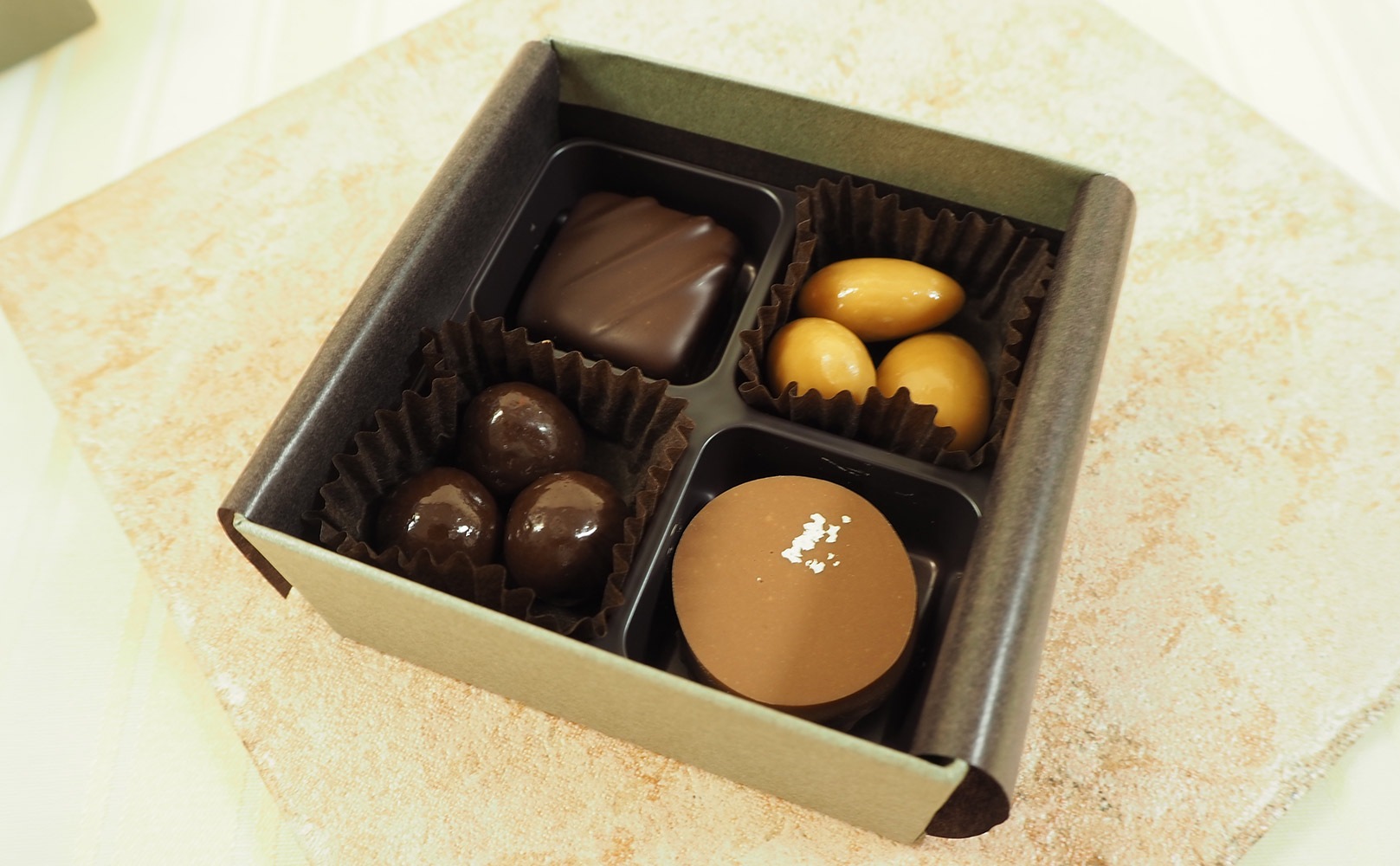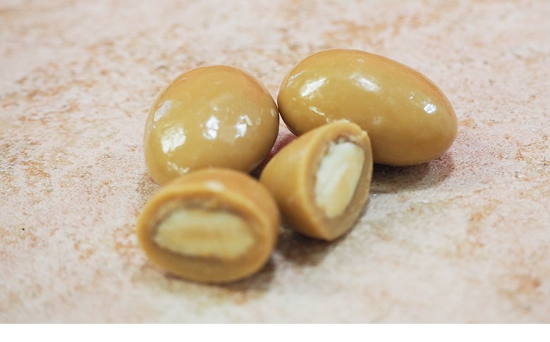 余香は、ローストしたアーモンドに香ばしい風味となめらかな甘みの後に感じるほのかな塩味がまるでビスケットを彷彿とさせる独特の味わいの世界初のブロンドチョコレート「ドゥルセ35%」をコーティングしました。