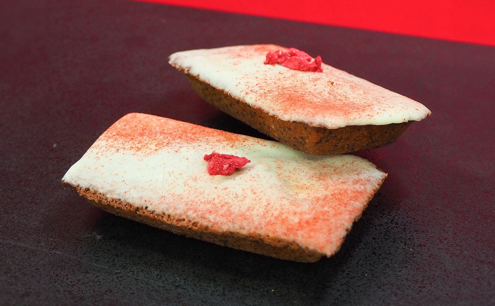 フィナンシェにホワイトチョコレートとフランボワーズを飾りました。